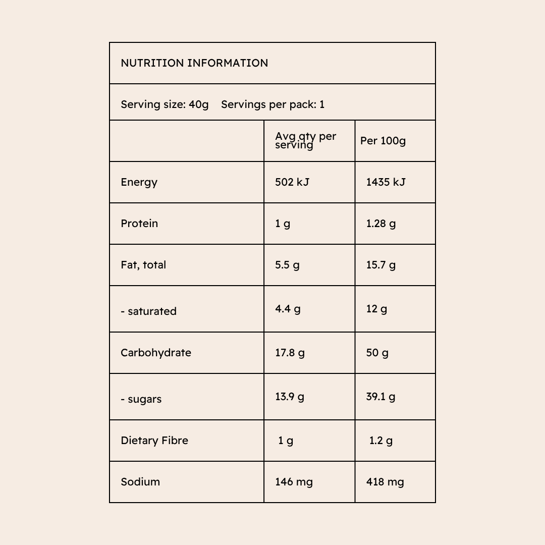 Organic Dark Chocolate 55% (Cocoa Mass, Sugar*, Cocoa Butter*, Raw Sugar*, Sunflower Lecithin*) raw sugar*, coconut milk*, coconut oil, cacao nibs*, gluten free glucose syrup*, vanilla extract, natural caramel extract, plant fibre, sea salt.